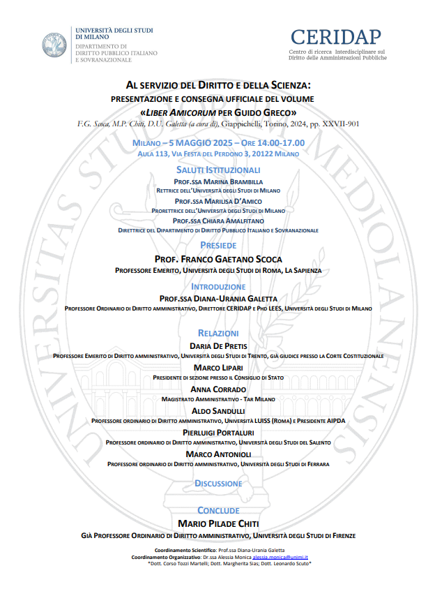 È stato pubblicato da Giappichelli, nella collana del Dipartimento di diritto pubblico italiano e sovranazionale dell’Università degli Studi di Milano, il “Liber Amicorum per Guido Greco”, a cura di Franco Gaetano Scoca, Mario Pilade Chiti e Diana-Urania Galetta.